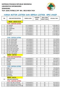 Dalam rangka ikut merealisasikan anjuran Pemerinah untuk menggunakan kendaraan yang ramah lingkungan, Koperasi Pegawai Republik Indonesia Universitas Diponegoro (KPRi UNDIP) akan mengadakan Pameran Sepeda Motor Listik . Produk sepeda motor yang akan dipamerkan berasal dari 3 (tiga) merek yaitu merek green tech, united dan Volta. Disamping Sepeda motor listrik, dipamerkan pula sepeda listrik.  Pengunjung dapat mencoba sepeda motor listrik (test drive) di tempat pameran.. Pemeran direncanakan dilaksanakan besok: